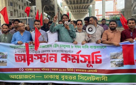৮ দাবিতে সিলেটবাসীর রেলপথ অবরোধ নিজেদের দীর্ঘদিনের ঝুলে থাকা দাবিগুলো নিয়ে এবার সরাসরি রেলপথ অবরোধের পথে হাঁটলেন বৃহত্তর সিলেটবাসী। শনিবার (১ নভেম্বর) সকালে রাজধানীর মগবাজার রেলগেট এলাকায় টাঙ্গুয়ার এক্সপ্রেস ট্রেনসহ মোট আট দফা দাবিতে তারা এই কর্মসূচি পালন করেন। তবে রেলওয়ে কর্তৃপক্ষের আশ্বাসে অল্প সময়ের মধ্যেই অবরোধ প্রত্যাহার করে নেওয়া হয়েছে। আন্দোলনকারীদের একজন সেলিম আহমেদ […]