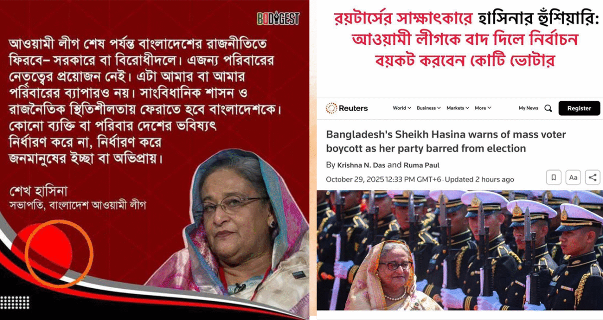 নয়াদিল্লি / ঢাকা, ২৯ অক্টোবর (রয়টার্স) — নির্বাসিত প্রধানমন্ত্রী শেখ হাসিনা বুধবার নয়াদিল্লি থেকে রয়টার্সকে জানিয়েছেন, বাংলাদেশের আওয়ামী লীগের লক্ষ লক্ষ সমর্থক আগামী বছরের জাতীয় নির্বাচন বর্জন করবে, কারণ দলটির নির্বাচনে অংশগ্রহণ নিষিদ্ধ করা হয়েছে।