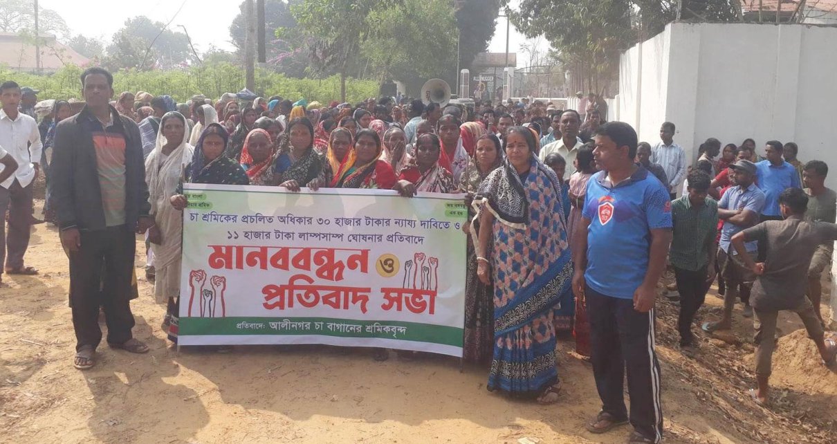 কমলগঞ্জে পূর্ণ বকেয়া মজুরি প্রদানের দাবিতে ৩টি চা বাগানে শ্রমিকদের বিক্ষোভ