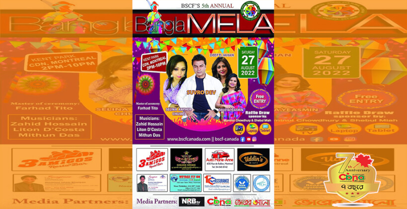 মন্ট্রিয়ল ২৪ আগস্ট। আর মাত্র দু’দিন পরই বাংলাদেশ সোসিও-কালচারাল ফোরাম(BSCF)এর আয়োজনে ৫ম বারের মতো অনুষ্ঠিত হবে মন্ট্রিয়লের ঐতিহ্যবাহী বাংলা মেলা।