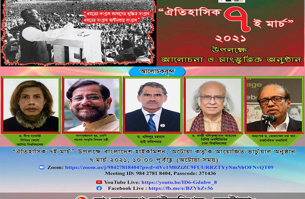 সিবিএনএ নিউজ ডেস্ক।। ঐতিহাসিক ৭ই মার্চ উদযাপন উপলক্ষে অটোয়াস্থ বাংলাদেশ হাইকমিশন আগামী ৭ মার্চ রবিবার বিভিন্ন কর্মসূচি গ্রহণ করেছে। তন্মধ্যে সকাল ১০ টা থেকে ১১টা পর্যন্ত আয়োজিত ভার্চুয়াল অনুষ্ঠানের মধ্যে সকাল ১০টায় জাতির পিতার প্রতিকৃতিতে পুষ্পার্ঘ্য অর্পণ, ১০টা ৫মিনিটে জাতীয় নেতৃবৃন্দের বাণী পাঠ।