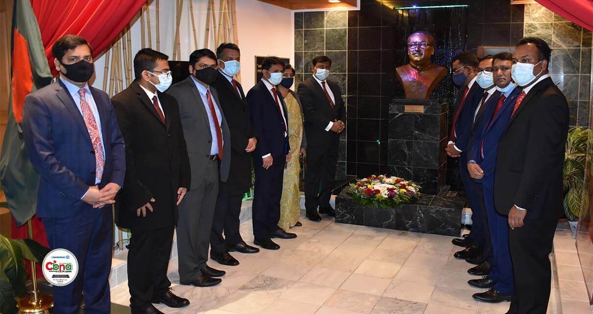 Washington D.C., March 17, 2021.The Embassy of Bangladesh in Washington DC celebrated the 101st Birth Anniversary of the Father of the Nation Bangabandhu Sheikh Mujibur Rahman and National Children’s Day, 2021, with due respect and fervor on March 17. On this occasion, Ambassador M Shahidul Islam hoisted the national flag in the Chancery premises. Later accompanied by the officials of the Embassy, he placed a floral wreath at the bust of the Father of the Nation, Bangabandhu Sheikh Mujibur Rahman.